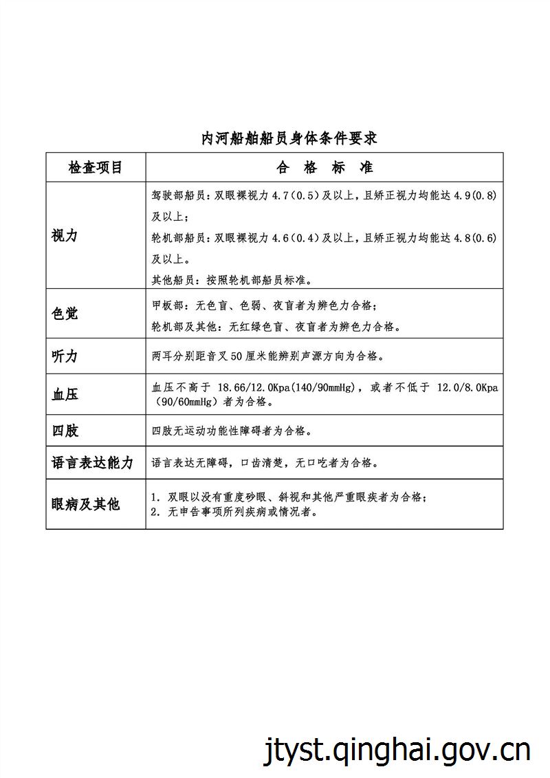 (一)符合国家海事管理机构规定的内河船舶船员适任岗位健康标准;