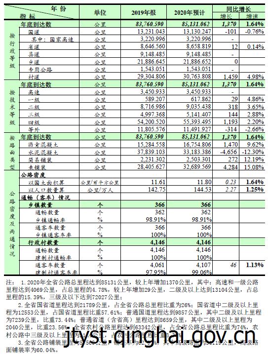 2020年全省公路里程到达数