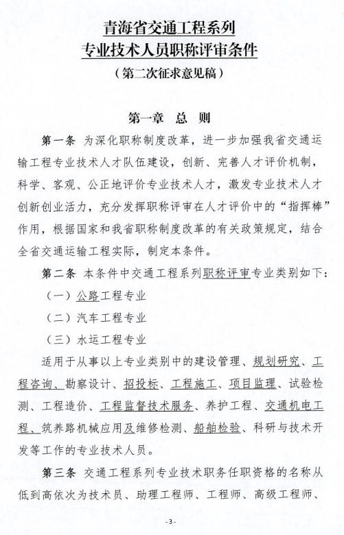 关于公开征求《青海省交通工程系列专业技术人员职称评审条件(第二次征求意见稿)》意见建议的通知