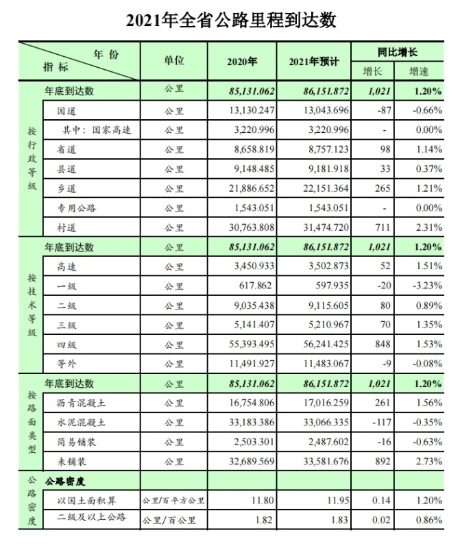 2021年全省公路里程到达数