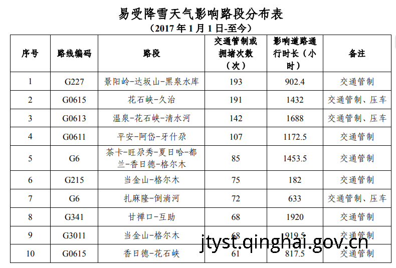 根据近年数据分析,易受降雪路段主要集中在高海拔地区 G227 张孟线俄博段,G0613 西丽高速共玉段,G0615 德马高速花 久段。(详见下图)