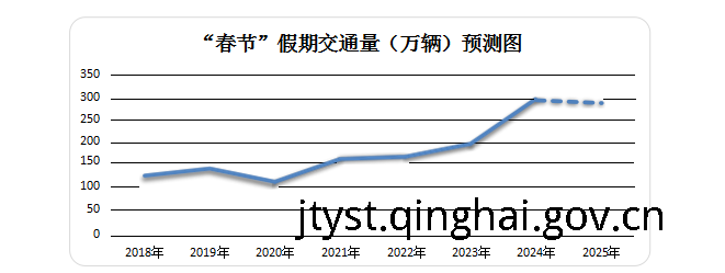 根据省公路局和省高速公路运营管理有限公司提供的历年数 据分析,近三年“春节”期间我省公路交通量呈增长趋势,交通量 分布呈现“西宁周边大、海西青南地区小”的特征, 其中交通量较 大收费站分别为 G6 京藏高速海东主线收费站、西宁西主线收费站, G0612 西和高速海东西主线收费站。2021 年“春节”期间日交通量 为 22.83 万辆;2022 年“春节”期间日交通量为 23.55 万辆;2023 年“春节”期间日交通量为 23.55 万辆;2024 年“春节”期间日交通 量为 32.70 万辆;2025 年“春节”(1 月 28 日-2 月 4 日)小长假 8 天,高速公路实行小型客车免费通行政策。预计交通量同比增加 10%左右,达到 36 万辆/日。1 月 27 日(腊月廿八)、1 月 28 日(除 夕)通往西宁道路交通量可能出现局部小高峰,随后交通量呈上升趋势,2 月 4 日(初七)西宁周边道路交通量可能出现小幅高峰, 2 月 5 日(初八)交通量将回落。高峰时段路网承压较重,尤其是在春节后返程的高峰时段,大流量路段将会出现明显的缓行拥堵。