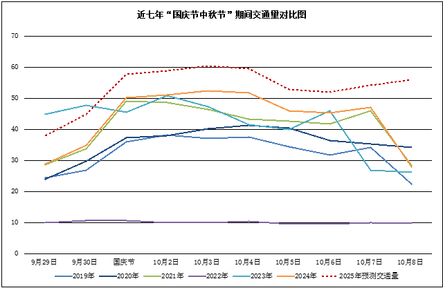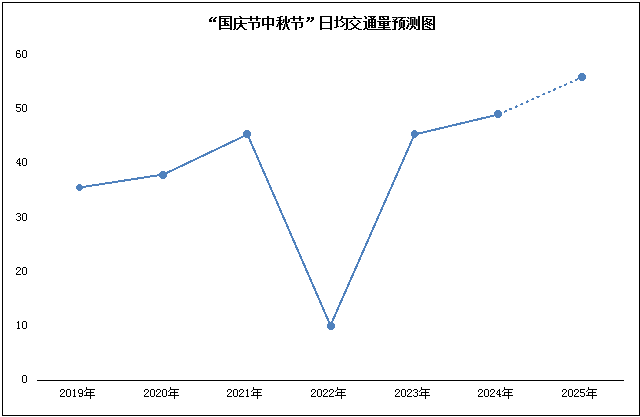 2025年“国庆节中秋节”8天(10月1日-10月8日),此次假期社会公众的出行需求旺盛,出行意愿强烈,预计交通量较去年增长15%左右,日均交通量可达56万辆左右。
